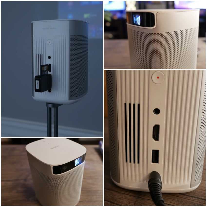 На верхней панели мы видим логотип компании и сенсорные кнопки регулировки громкости, пауза и пуск. Портов, по сравнению с предыдущей моделью, стало меньше. Производитель оставил самые важные соединения, такие как USB 2.0, HDMI, DC и разъем для наушников или микрофона. Все они расположена на задней панели, рядом с кнопкой включения и решеткой охлаждения. Очень удобно, что они не разбросаны по всему проектору.