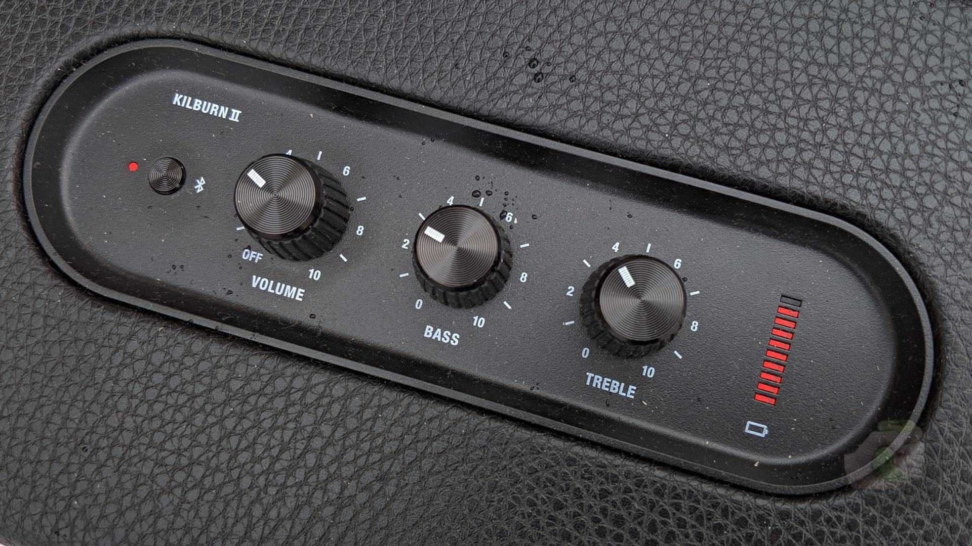 В верхней части динамика расположены три ручки: одна для управления громкостью динамика и его включения, а две другие — для настройки низких и высоких частот. Здесь вы также найдете кнопку сопряжения Bluetooth и индикатор уровня заряда батареи — его красный цвет очень похож на питание большего усилителя Marshall.