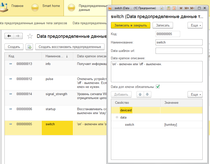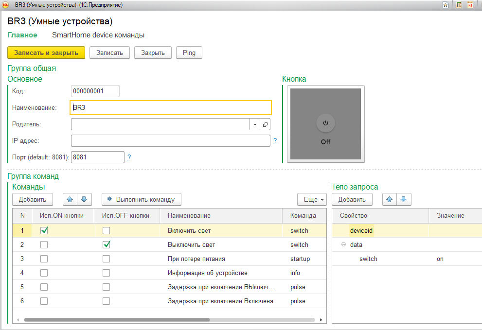 Здесь хранятся сами умные устройства. Имеют дополнительные реквизиты «IP адрес» и «Порт». Табличную часть «Команды устройства», которые можно послать в адрес устройства для исполнения.