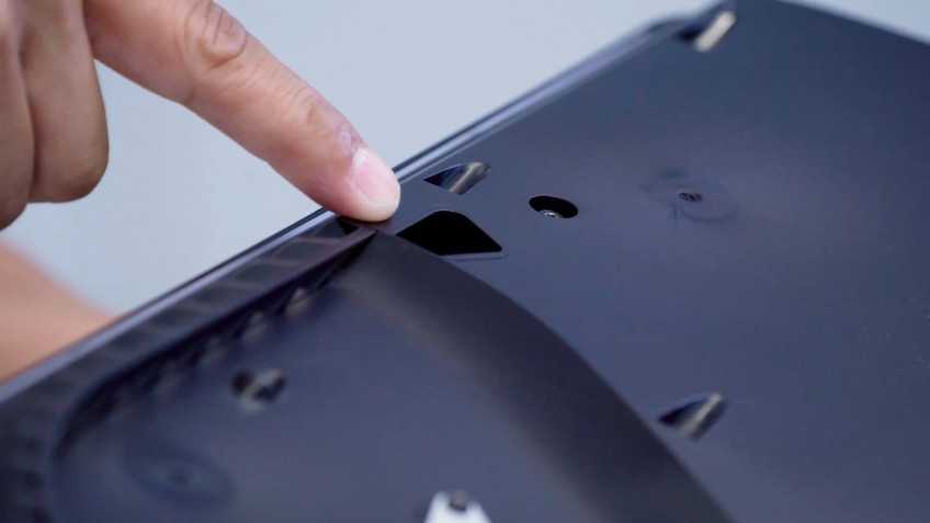 Боковые панели у PS5 съёмные: для этого надо ухватить их сверху и снизу и потянуть вниз. Под ними — чёрный пластик и утилитарные металлические заглушки. Но, самое главное, так открывается доступ к вентилятору, с которого через пару лет можно будет снять куски пыли, отсеку под дополнительный SSD на M.2 размером до 22100 и технологическим отверстиям, в которые собирается пыль. К ним можно поднести пылесос и удалить приличное количество грязи.