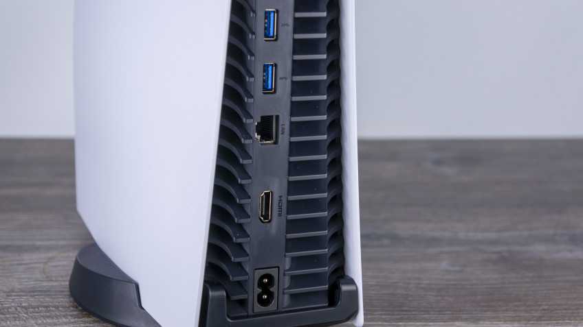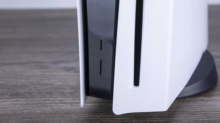 По управлению и разъёмам PS5 аналогична конкуренту. Кнопок две — питание и выброс диска, — и стоят они внизу чёрной стойки. Клавиши тонкие и мягкие, но пользоваться ими придётся нечасто: консоль прекрасно запускается с геймпада. Здесь же, на лицевой панели, разместились два USB третьей версии, один из которых — Type-C. Зачем он сейчас Sony — не совсем понятно, но это неплохой задел на будущее, когда вслед за Apple многие откажутся от Type-A.