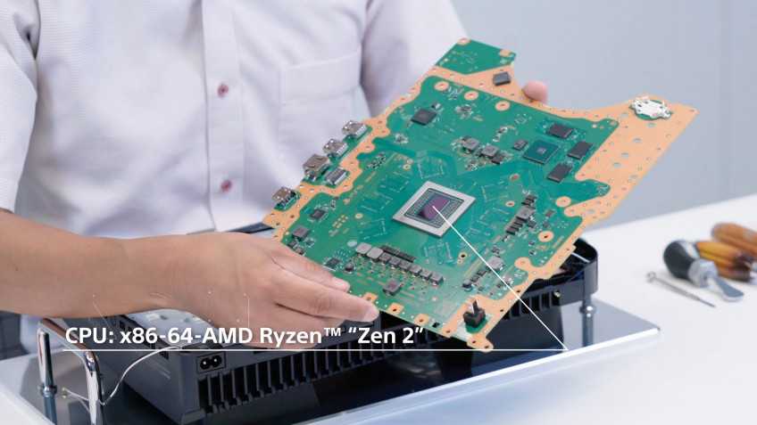Как и Series X, PlayStation 5 построена на платформе AMD. В основе лежит единый блок APU, который совмещает видеокарту и процессор. Последний — такой же, как у Microsoft: это аналог настольного Ryzen 7 3700, восемь ядер и шестнадцать потоков. Только если Microsoft для него заявляет стабильные частоты в 3,6 и 3,8 ГГц (в зависимости от количества потоков), то Sony установила динамическую частоту, ограничив её максимумом в 3,5 ГГц.