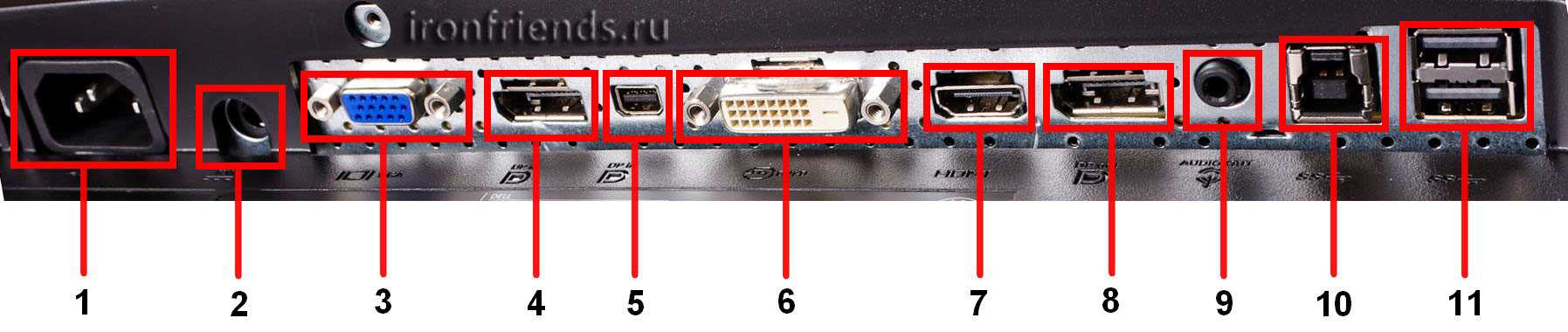 1. Разъем питания 220 В.2. Разъем питания для мониторов с внешним блоком питания или питания колонок.3. Разъем VGA (D-SUB) для подключения к компьютеру со старой видеокартой. Не является обязательным, так как для этого можно использовать переходник.4,8. Разъемы Display Port для подключение к современной видеокарте. Поддерживают высокое разрешение и частоту обновления более 60 Гц (для игровых и 3D мониторов). Не являются обязательными если есть DVI и монитор не поддерживает частоту более 60 Гц.5. Разъем Mini Display Port такой же разъем меньшего формата, не обязателен.6. Разъем DVI для подключения к компьютеру с современной видеокартой. Должен быть обязательно если нет других цифровых разъемов (Display Port, HDMI).7. Разъем HDMI для подключения компьютера, ноутбука, ТВ-тюнера и других устройств, желательно наличие такого разъема.9. Аудио разъем 3,5 мм для подключения звука к мониторам со встроенными динамиками, внешних колонок или наушников, не обязателен, но в некоторых случаях такое решение может быть удобным.10. Разъем USB для подключения встроенного в монитор USB концентратора, есть не везде и не является обязательным.11. Разъемы USB в мониторах с USB концентратором для подключения флешек, мышки, клавиатуры и других устройств, не являются обязательными, но в некоторых случаях это может быть удобно.