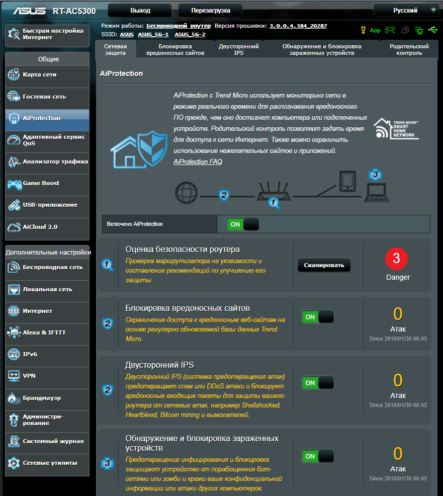 Стоит отметить, что роутер RT-AC88U, как и некоторые другие старшие модели ASUS, поддерживает технологию ASUS AiProtection, представляющую собой встроенные в роутер антивирус, фаервол, веб-фильтр вредоносных интернет-сайтов и функцию «родительского контроля».