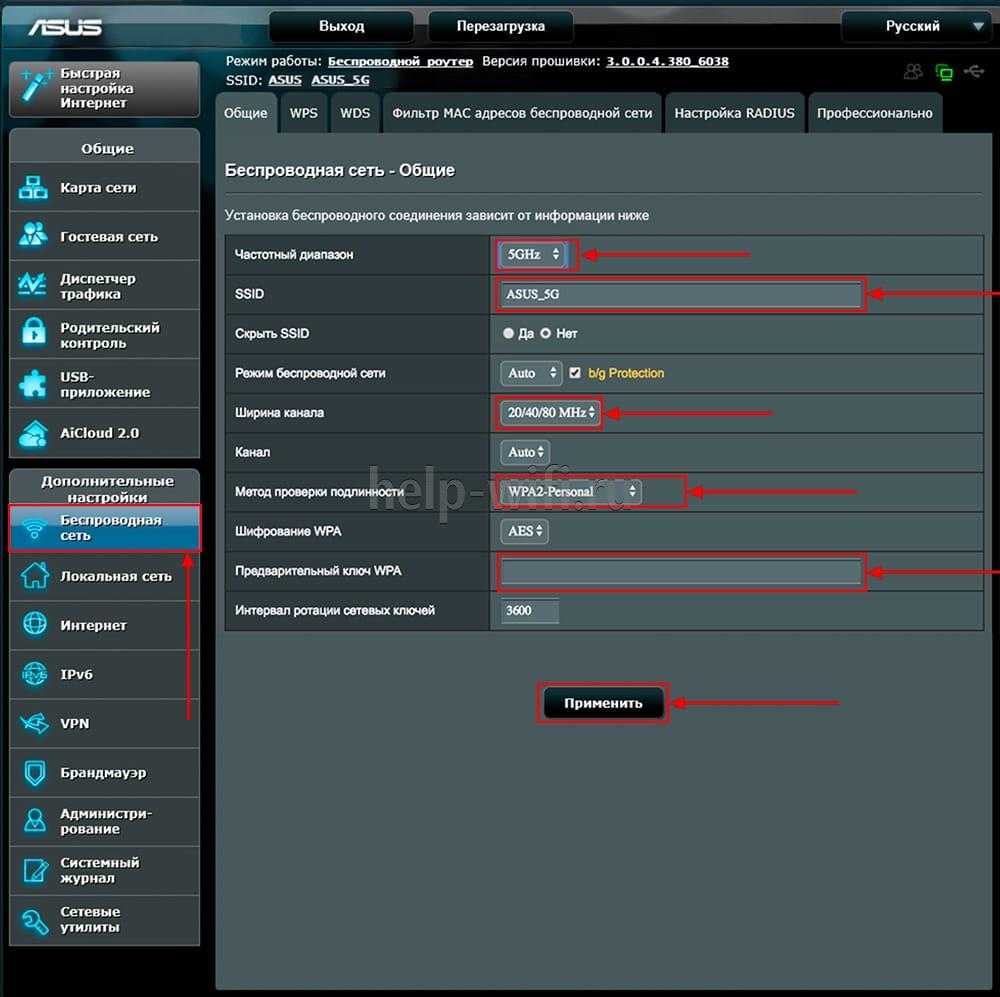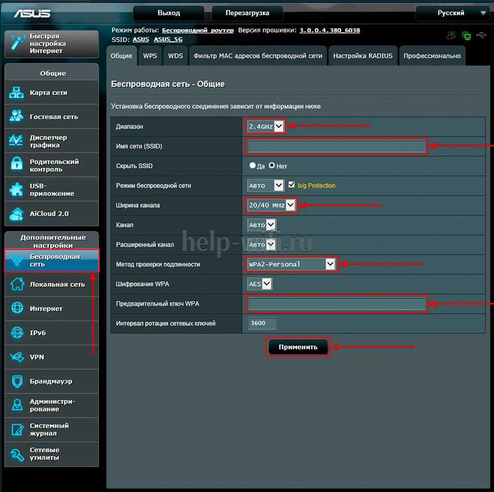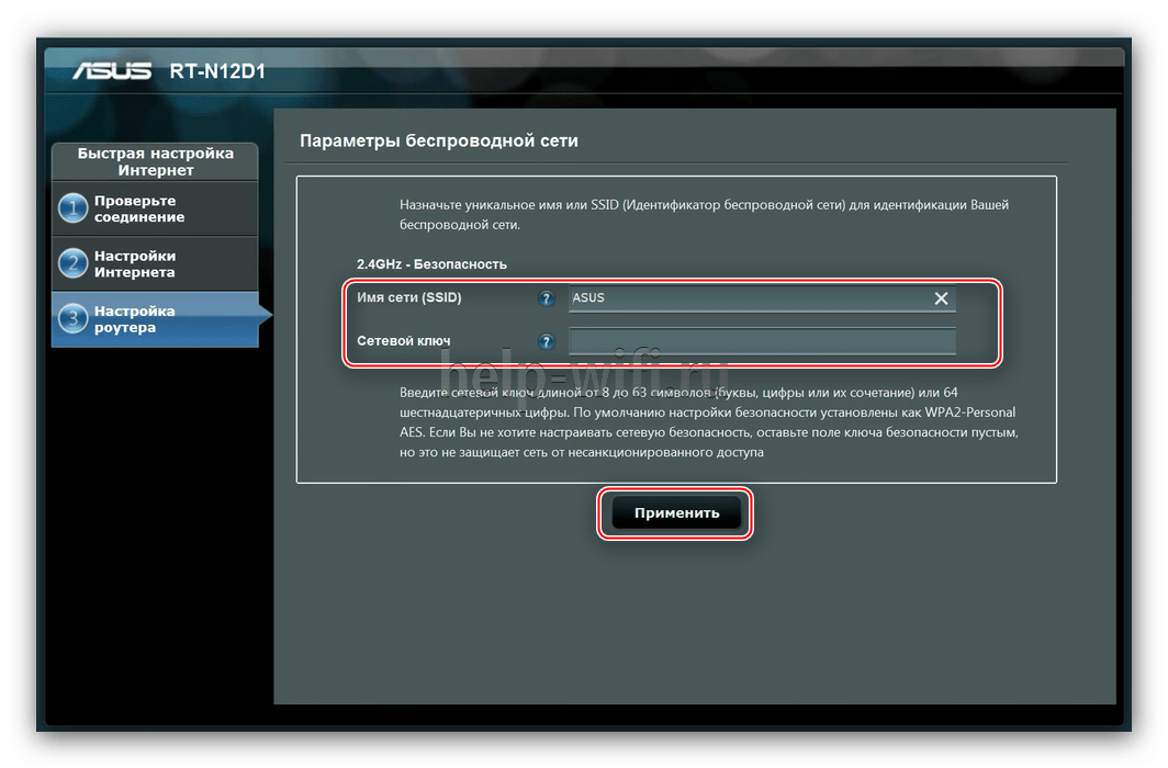 - В настройках беспроводной сети задайте название для точек доступа 2,4 ГГц и 5 ГГц. Имена обеих точек должны различаться. Сетевой ключ можно придумать свой или посмотреть на крышке роутера. Он должен содержать от 8 до 63 символов. Введя данные точек доступа беспроводной сети, нажмите «Применить».