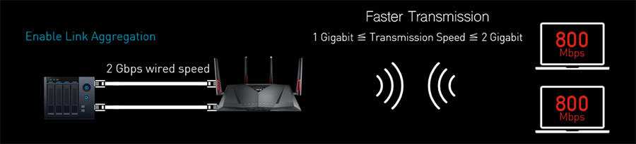 Для увеличения скорости соединения по локальной сети с помощью агрегирования каналов Link Aggregation у RT-AC88U объединяются 1-й и 2-й порты Ethernet и создается высокоскоростной канал с пропускной способностью до 2 Гбит/с. Link Aggregation требует поддержки со стороны клиента.