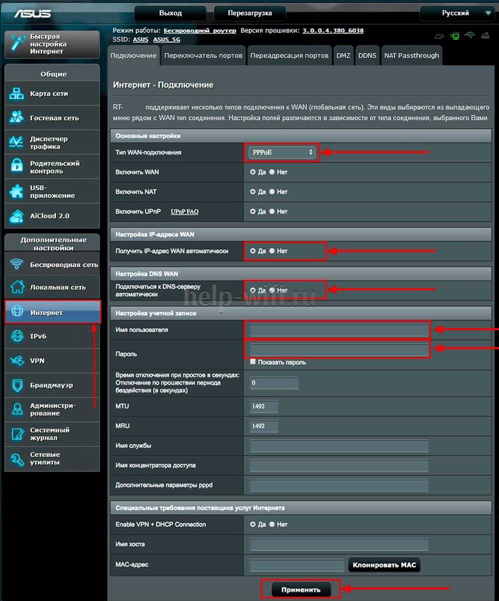 Для передачи интернета через маршрутизатор ASUS RT AC57U большинством операторов используется протокол PPPoE. Это касается таких провайдеров как ТТК, Ростелеком, Дом.ру.