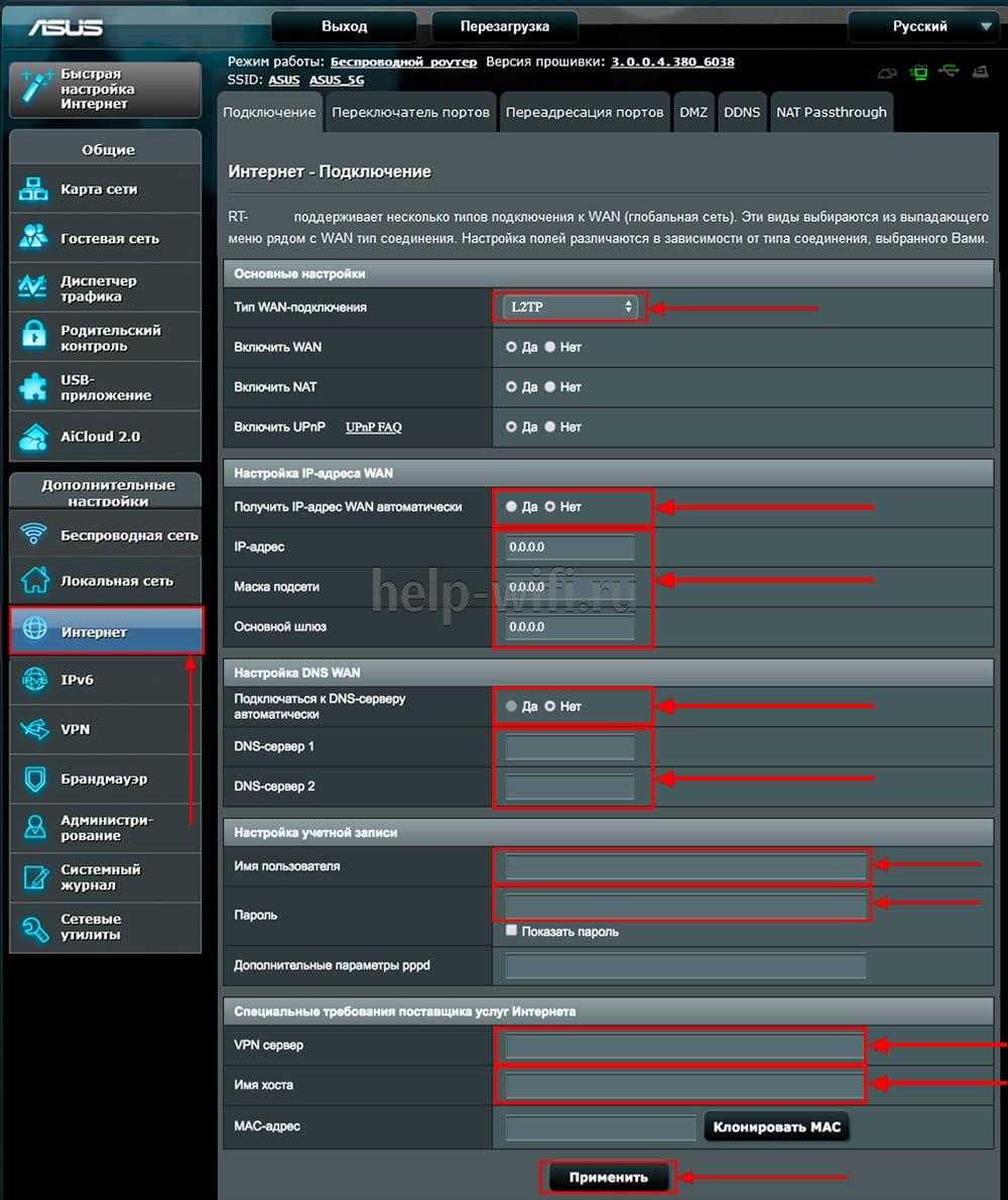 - «Тип WAN-подключения» устанавливается значение «L2TP» У трех пунктов, идущих ниже, должно стоять значение «Да».