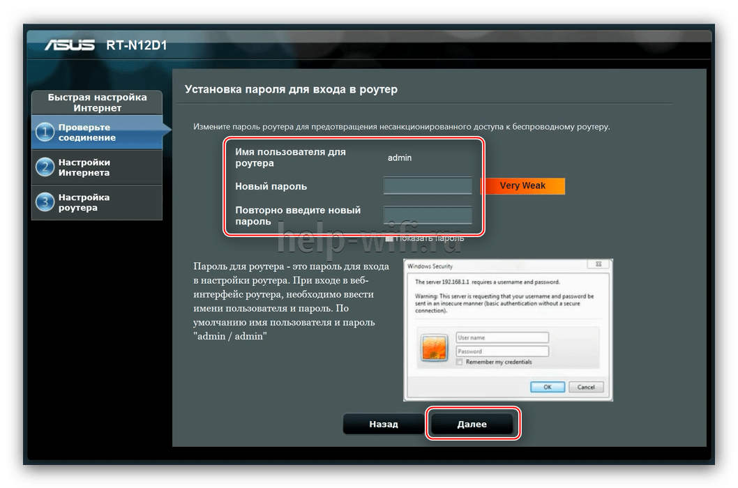 1. В первую очередь потребуется сменить стандартный пароль на более сильный. Этот шаг нельзя пропустить. Введите новый пароль и повторите его. Дополнительно можно сменить имя пользователя, но необязательно.