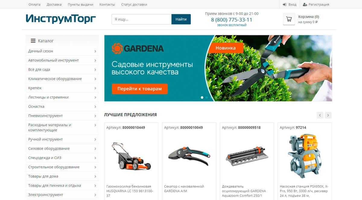 ИнструмТорг – это низкие цены на климатическое оборудование, ручной инструмент, расходные материалы, пневмоинструмент и лестницы. Среди мировых брендов можно встретить Matrix, Hunter, Husqvarna, Stern и Gardena. Покупатели могут выбрать доставку по городам (Москва, Санкт-Петербург) курьерской службой, почтой России или транспортной компанией.