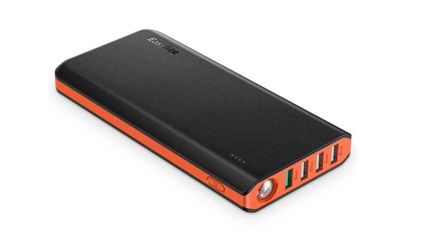 Последним внешним аккумулятором с большой емкостью, в этом списке является — EasyAcc с ёмкостью 20 000 мАч. Что выделяет этот аккумуляторный блок от остальных, это четыре USB-порта для одновременного зарядки нескольких устройств, причем один из них поддерживает функции быстрой зарядки Qualcomm QuickCharge 3.0. Еще одна полезная функция — наличие двух входов, в том числе один с поддержкой QC 3.0, и оба могут использоваться для зарядки аккумулятора быстрее, чем другие аналогичные устройства. И для тех, кому это может пригодиться, батарея EasyAcc также имеет яркий фонарик. Благодаря перечисленным достоинствам, я считаю этот Power Bank одним из лучших внешних аккумуляторов для телефонов, которые есть сейчас на рынке.