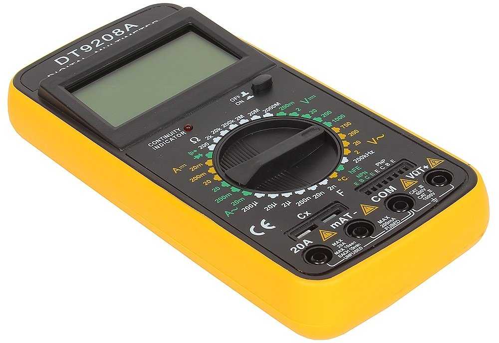 Ресанта DT 830В – замеряет постоянный и переменный ток, сопротивление, тестирует транзисторы и диоды. Предусмотрен переключатель на 20 режимов, защита от перегрузок, питание от кроны. Прибор может применяться в быту, для автомобиля и в небольших автомастерских. Минусами являются отсутствие режима автоотключения и тонкие щупы, склонные к обрыву;