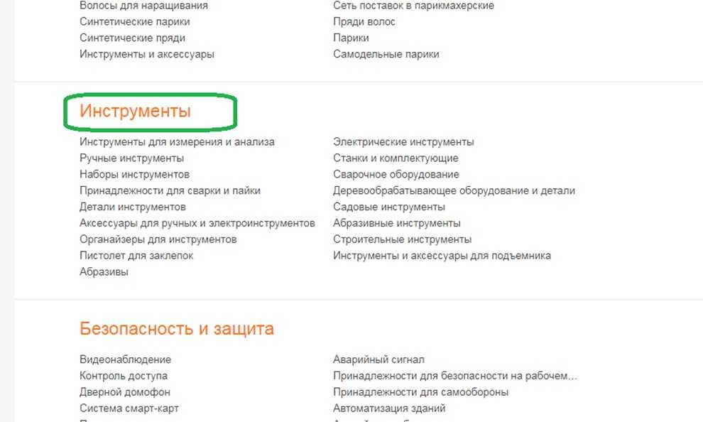 - Откроется перечень всех доступных категорий товаров. Потребуется промотать страницу до раздела под названием «Инструменты» и выбрать его.
